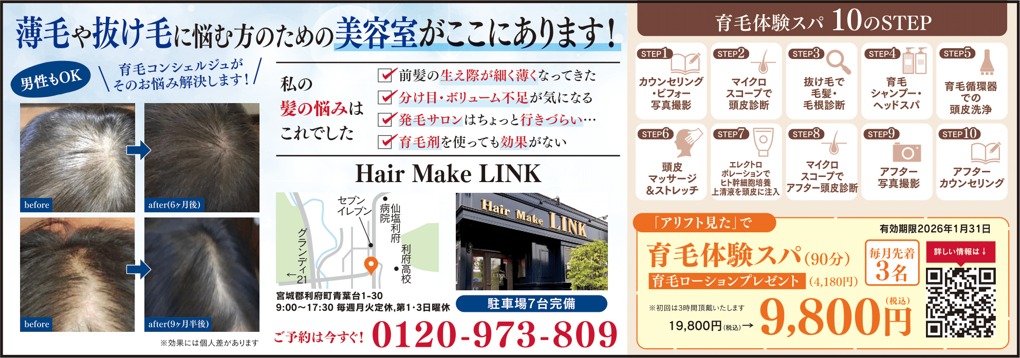 それに対し、Hair Make LINKでは、ホームページとブログ、そして集合チラシ、お客様の口コミだけで広告宣伝をしているため、大手よりもリーズナブルな価格にてご案内することが可能です。